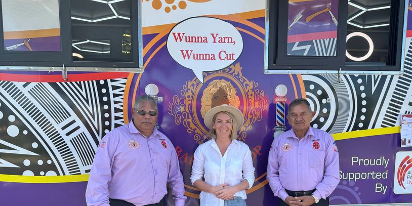 Cr. Sophie Bougoure of Western Downs Regional Council, with Floyd Leedie, CEO and Gary White, Chairperson the Goondir Health Services “Wunna Yarn, Wunna Cut” mobile barber shop counselling service.